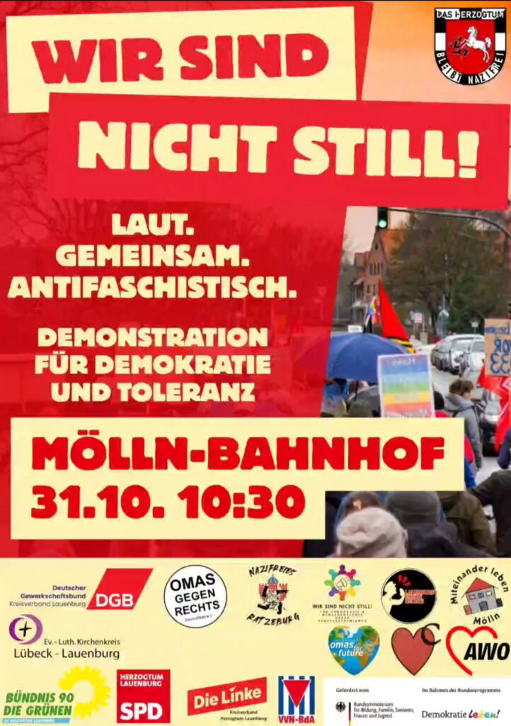 Die Demonstration für Demokratie und Toleranz „WirSindNichtStill“ findet in diesem Jahr in Mölln statt.