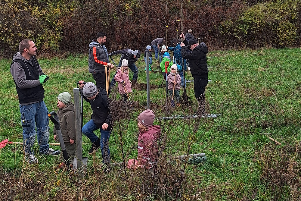 Zu einer gemeinsamen Pflanzaktion der Gemeinde konnte der Vorsitzende des Berkenthiner Umweltausschusses Ralf Hess am Samstagvormittag, dem 15.11.2025, Kinder und Eltern des Kindergartens Kunterbunt sowie weitere Freiwillige auf dem sogenannten Sichelgrundstück an der Von-Parkentin-Straße begrüßen.