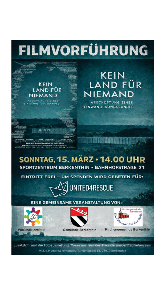 Am Sonntag, 15. März, um 14 Uhr wird im Sportzentrum Berkenthin, Bahnhofstraße 21, der Dokumentarfilm „Kein Land für Niemand – Abschottung eines Einwanderungslandes“ gezeigt. Der Eintritt ist frei, Spenden für United4Rescue sind willkommen.