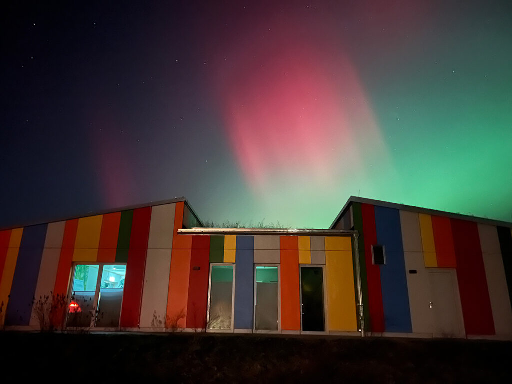 Foto von der „Villa Kunterbunt“ in der Von-Parkentin-Straße unter dem Polarlicht vom 19. Januar 2026 (echt, keine Fotomontage).